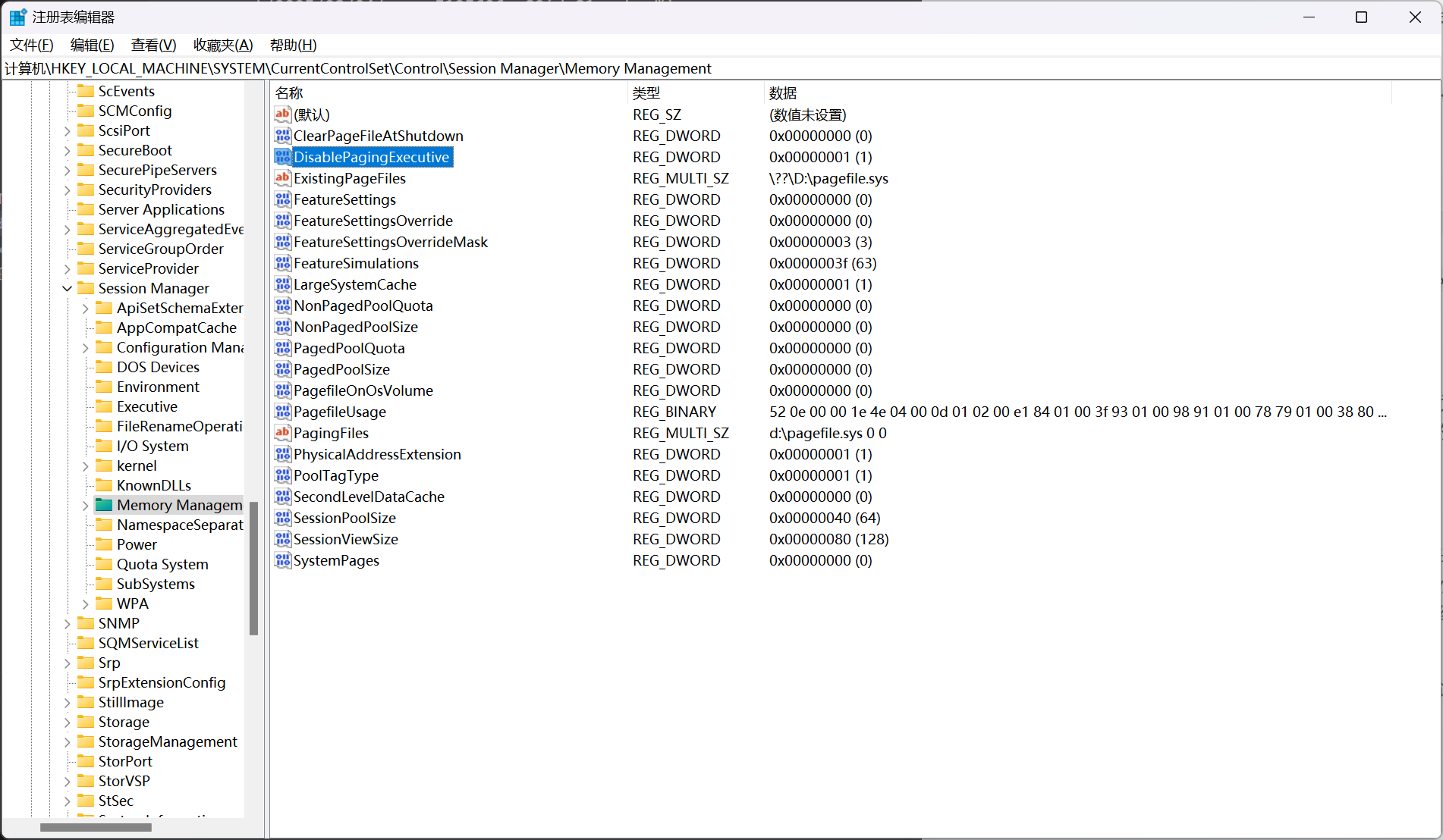 这里我们找到并双击 DisablePagingExecutive 项,将数值改为