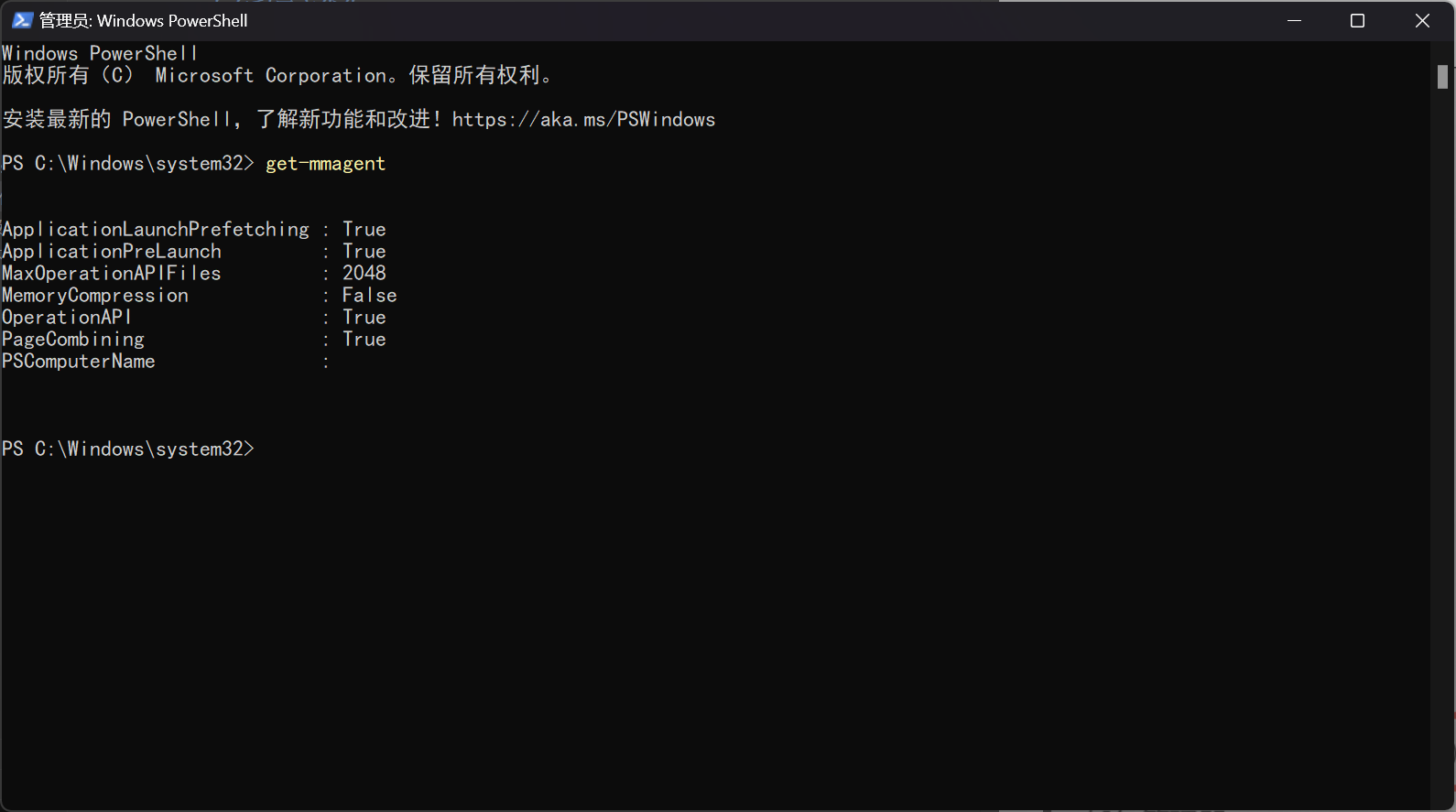 运行命令 get-mmagent 查看系统预读取状况,True 就是开启,False 就是关闭: